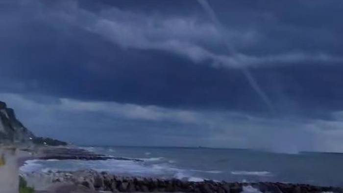 Очевидцы заметили образовавшуюся воронку над поверхностью моря. При этом верхнюю часть смерча сильно исказил ветер.