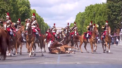 Лошадь республиканской гвардии, которая принимала участие в параде в честь Национального праздника в Париже, в понедельник, 14 июля, поскользнулась на брусчатке и упала перед президентской трибуной вместе с наездником.