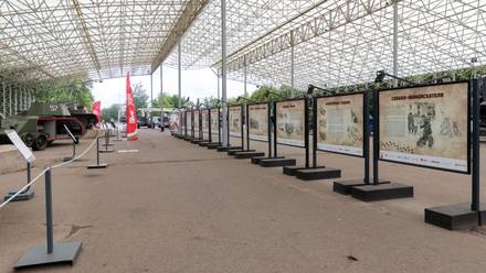 Выставку дополняют фотодокументальные материалы, например кадры шествия колонны саперов с их боевыми четвероногими товарищами на Параде Победы 24 июня 1945 года.