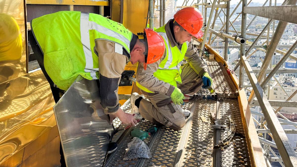 Под каждым фрагментом рабочие восстанавливают металлическую обрешетку и выполняют гидроизоляцию. Листы устанавливаются особым замковым способом, что обеспечивает надежную герметичность. Общий вес нового покрытия составит около 15 тонн. Работы выполняют вручную кровельщики небольшими бригадами на высоте до 100 метров, в проекте участвуют лучшие специалисты из разных регионов России.