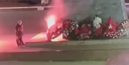 На опубликованных кадрах видно, как двое мальчиков ходят вокруг Вечного огня, а затем один из них поджигает предмет и переносит огонь на венки.