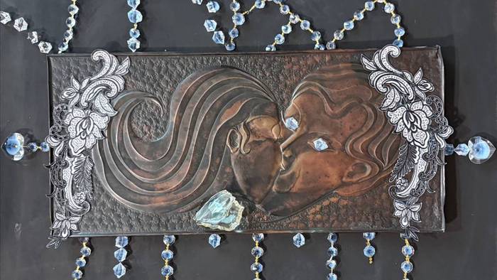 Гай Германика также показала фото подарка в своем Telegram-канале: люстра выполнена в виде прямоугольной композиции с изображением целующейся пары, а по краям украшена небольшими хрустальными шарами.