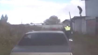 Во время преследования нарушитель заехал на территорию гаражного кооператива, покинул машину и попытался убежать. Однако местный житель, наблюдавший за происходящим с крыши гаража, бросил в беглеца полено, в результате чего тот упал и был задержан.