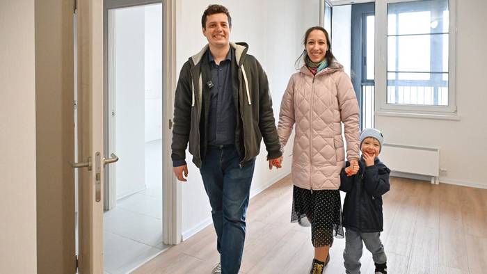 Семья Прокоповых — Максим, Евгения и их маленький сын Константин в своей новой квартире в доме, построенном по программе реновации на Нагорной улице