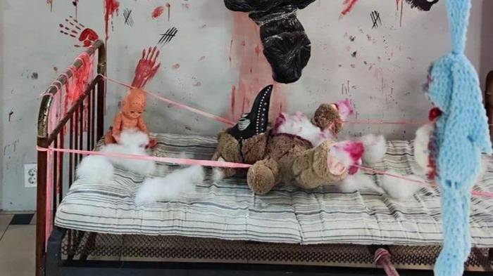 Помимо этого, среди тыкв и паутины детей также ждала кровать с распоротым плюшевым мишкой в маске чумного доктора, стены, залитые красной краской, и подвешенный в углу черный пакет, обмотанный скотчем и цепью.