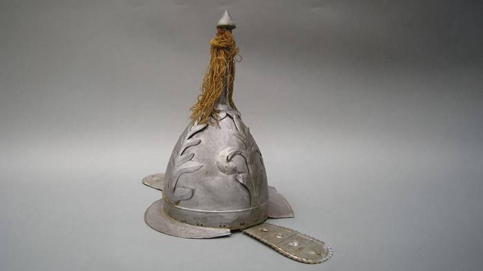 Шлем изготовлен из тонкой белой жести и имитирует головной убор античного воина. Он украшен накладными пластинами с растительным орнаментом, снабжен съемными наушниками и козырьками на лобной и шейной частях. Завершается шлем шпилем с заостренной головкой и декоративным элементом из шерстяных нитей красно-бурого оттенка, который напоминает конский хвост. Размер реквизита подходит только для небольшой головы. Благодаря тонкости металла, из которого сделан предмет, он достаточно легкий, передает сайт мэра Москвы.