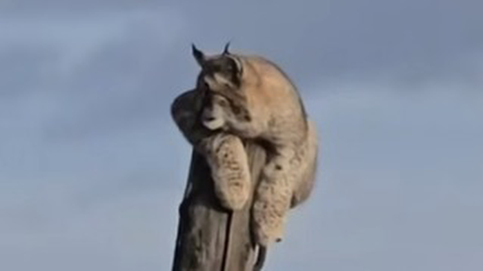 Рысь забралась на столб в поселке Могойтуй в Забайкалье. Об этом в четверг, 30 октября, пишет Telegram-канал «112».