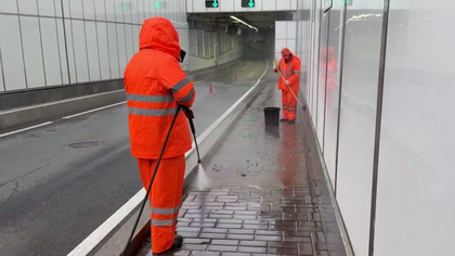 Промывка тоннелей проводится только при плюсовой температуре в ночное время с 22:00 до 6:00 или в выходные дни. Специалисты с помощью аппаратов высокого давления и специальных растворов промыли парапеты и стены инженерных сооружений, провели очистку дренажных систем, привели в порядок смотровые и сточные колодцы водосточной сети.