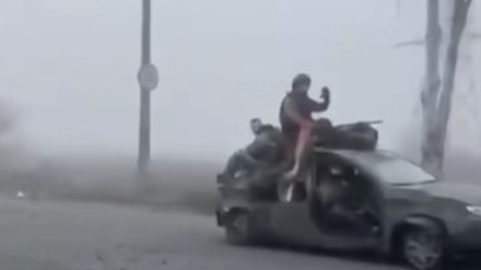На кадрах видно, как в город по трассе Е50 заезжают мотоциклы, легковые автомобили и другая техника с российскими солдатами. На фоне — сильный туман, который значительно ухудшил видимость.