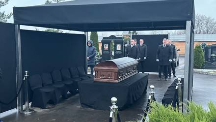 Прощающимся предложили в последний раз приложить руку к гробу с телом артиста. Соболевская стоит справа от остальных. Артистка не смогла сдержать эмоций, прощаясь с мужем.