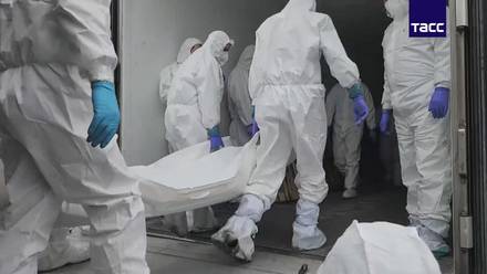 На видео показано, как пакеты с телами военных переносят из грузовиков.