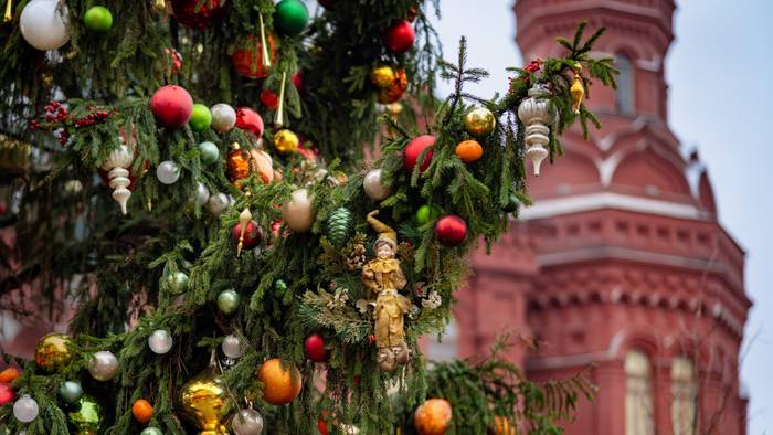 На Манежной площади установили натуральную 22-метровую ель. При украшении декораций использовали более 10 тысяч игрушек и около пяти километров световых гирлянд. Работать с такой высотой помогали профессиональные альпинисты.