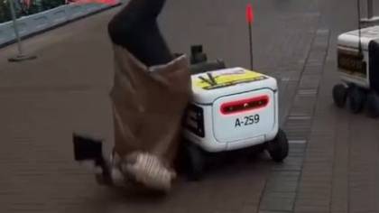 Женщина во время прогулки по Арбату заметила роботов-доставщиков, которых решила снять на видео. Прохожая не увидела, как один из них оказался прямо за ней. Она споткнулась об него и, перевернувшись вниз головой, упала на дорогу.
