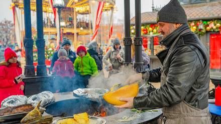 Участники фестиваля «Путешествие в Рождество» предлагают москвичам вкусные сезонные блюда, специально подготовленные шеф-поварами для того, чтобы их было удобно есть во время прогулки по городу.
