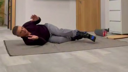 Мясников надел джамперы, прошелся в них, попрыгал, а затем попытался встать на фитнес-тренажер, который представляет собой доску на валике. Врач несколько раз пытался встать на доску, но в результате не смог удержать равновесие и упал на бок.