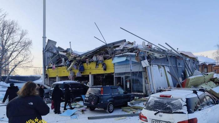 Внутри здания находились продуктовый магазин, алкомаркет, центр одежды и обуви. Обрушился весь второй этаж.