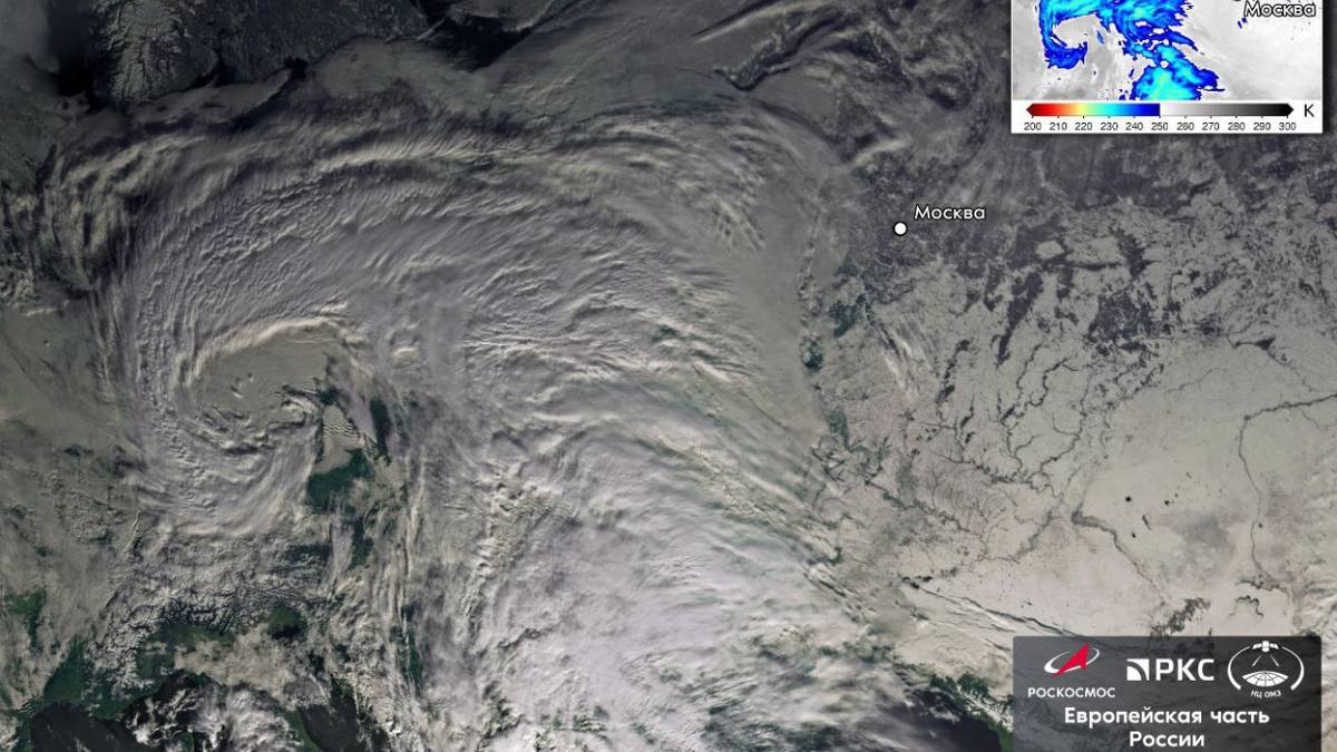 Роскосмос показал, как выглядит двигающийся к Москве циклон. Соответствующий пост в понедельник, 26 января, появился в Telegram-канале госкорпорации.