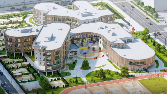 Школьный блок будет переменной этажности, со специализированными и универсальными учебными кабинетами и двумя спортивными залами. Центральной частью станет многосветное многофункциональное пространство с медиатекой и обеденным залом.