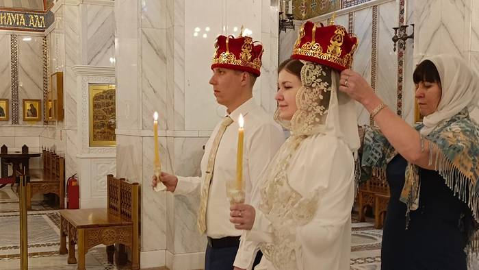Таинство венчания начинается. Отец Александр читает молитву, поворачивается к супругам и спрашивает каждого: готовы ли они к таинству, не давали ли кому-нибудь другому обещание о венчании? Оба отвечают: «Нет». Священник надевает им кольца, и по окончании службы супруги получают свидетельство о венчании. Илья и Светлана вместе уже 10 лет, воспитывают двух сыновей: старший — Михаил, младший — Дмитрий.