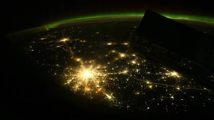 На снимок также попало полярное сияние над контуром ночной Земли.