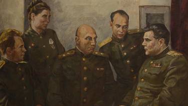 На полотне изображены известные герои Великой Отечественной войны: летчики Покрышкин и Кожедуб, конструкторы Грабин, Кошкин, Ильюшин, генералы Ефремов, Карбышев, Родимцев, Катуков, герой-пограничник Кайманов, танкист Лавриненко, партизан Ковпак и другие.