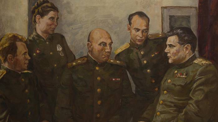 — По обе стороны главной композиционной группы — солдаты разных родов войск, ополченцы, рабочие, конструкторы, женщины, дети, старики. Картина словно отказывается от индивидуального портрета в пользу коллективного героя, — подчеркнули в Музее Победы.