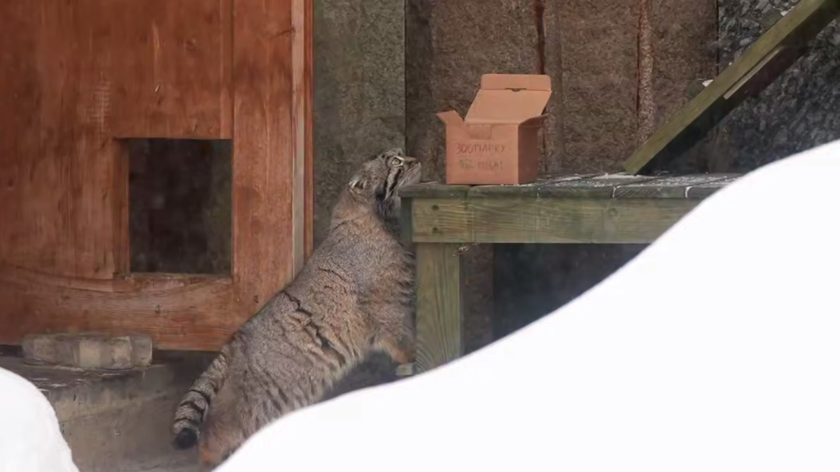 Манулу Тимофею принесли коробку с перепелкой в честь 162-го дня рождения Московского зоопарка / Видео: Telegram / Московский зоопарк