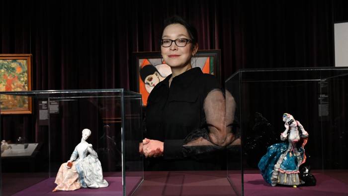 Слева от куратора Ольги Юркиной — «Дама с розой» Василия Кузнецова и Наталии Данько (1924), справа — «Дама с маской» Константина Сомова (1923)