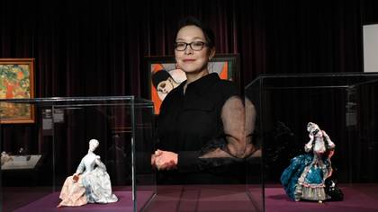 Слева от куратора Ольги Юркиной — «Дама с розой» Василия Кузнецова и Наталии Данько (1924), справа — «Дама с маской» Константина Сомова (1923) / Фото: Мария Хапцова / Вечерняя Москва