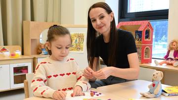 Воспитатель детского сада школы № 2094 Ольга Омельчук лепит из пластилина с Джамилей Яхьяевой в новом современном корпусе / Фото: Мария Хапцова / Вечерняя Москва
