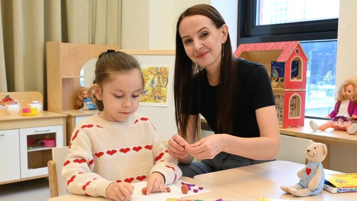 Воспитатель детского сада школы № 2094 Ольга Омельчук лепит из пластилина с Джамилей Яхьяевой в новом современном корпусе
