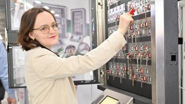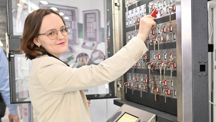 Инженер-технолог московской компании Анна Московец показывает аппарат для хранения ключей, который выдает определенные ключи определенным людям. Информация о полномочиях записывается на карточку