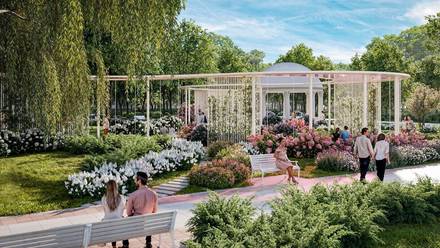 Новый торжественный вход в парк со стороны Олимпийского проспекта украсит живописная арка с видом на Большой Екатерининский пруд. Рядом будут размещены удобные объекты инфраструктуры: лодочная станция с солярием и кафе с просторной террасой.
