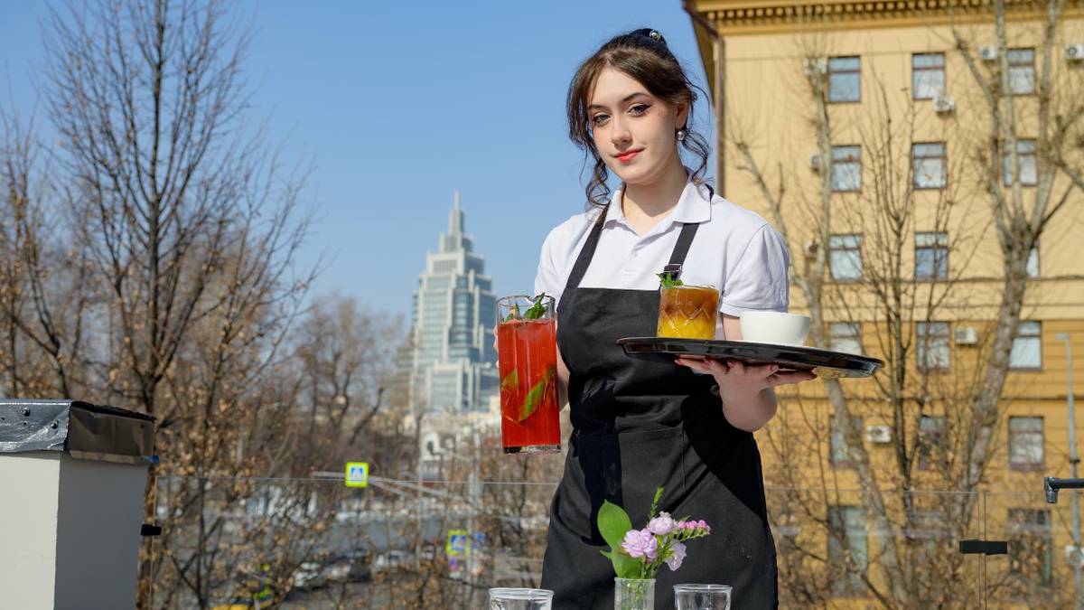 Официант Анна Каторгина готовится к сезону летних веранд. Для гостей ресторана на Петровке будет работать открытая площадка на крыше заведения