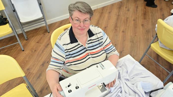 Волонтер фонда «Лавка радостей» Анна Саланда шьет постельное белье для одиноких пожилых людей