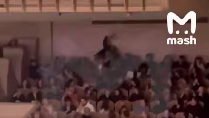 На распространившихся в Сети кадрах видно, как двое мужчин дерутся и толкаются на последних рядах в то время, как оркестр и вокалист исполняют композицию на сцене, передает Telegram-канал.