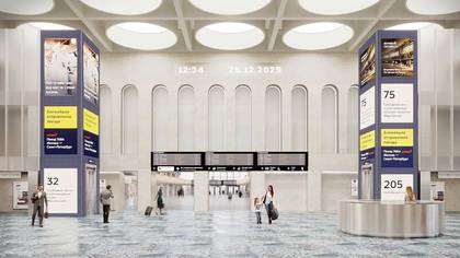 А в кассовом зале и зоне лифтов будут установлены цифровые колонны с актуальной информацией, а сами кассы оснастят экранами и обновленной системой электронной очереди. На втором этаже, в зоне фудкорта, появится медиакуб со светодиодной тканью, транслирующий расписание и медиаконтент. На распределительной площадке разместят цифровые перронные стелы, табло с повагонной нумерацией и информационные модули.