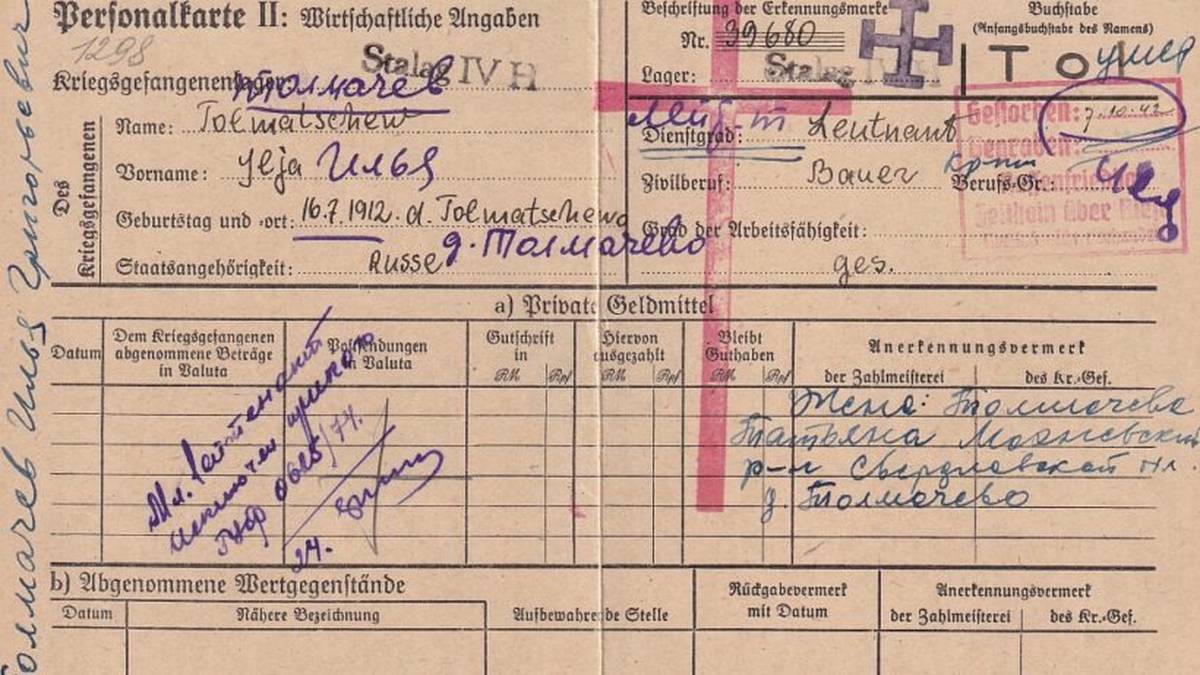 Сотрудники Центра сохранения памяти о советских военнопленных выяснили, что Илья Григорьевич Толмачев родился в июле 1912 года в селе Толмачево Свердловской области. Работал учителем. У него была жена Татьяна Захаровна Толмачева. Затем Илью Григорьевича призвали в армию, там он был политруком. Во время Великой Отечественной войны служил в 295-м пехотном полку. Лейтенант Илья Толмачев попал в плен в октябре 1941 года в районе города Старица Тверской области. Был отправлен в Шталаг IV H (304), где умер в октябре 1942 года. Похоронен в Цайтхайне.