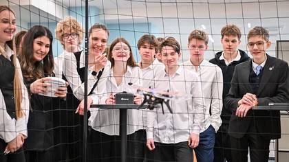 Ученики 10-го инженерного класса школы № 1360 запускают беспилотный летательный аппарат на специальном полигоне, который оборудовали в новом корпусе этого образовательного учреждения / Фото: Максим Мишин / Пресс-служба мэра и Правительства Москвы
