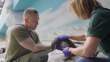 Сотрудники отдела орнитологии Московского зоопарка, ведущий зоотехник Александр Павлов вместе с ведущим зоологом Гаяне Пилоян ставят крылометку на птенца пингвинов Гумбольдта / Фото: Пресс-служба Департамента культуры города Москвы