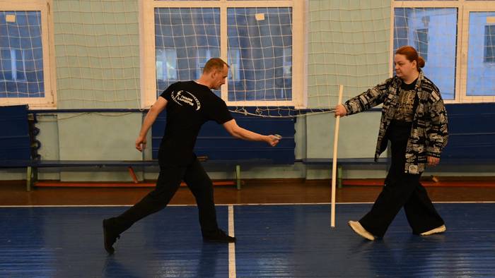 Он берет в руки небольшую палку и пробует меня ударить (останавливая ее буквально в десяти сантиметрах от меня). В это время я должна упасть на мат и сыграть лицом, что мне очень больно. И тут главное — не вставать сразу.