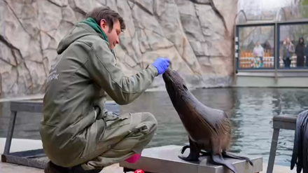 Морской котик уже умеет кружиться по команде «вальс», следовать за таргетом, выполнять команды «место» и «в воду», издавать звуки по команде и вставать на весы для взвешивания.