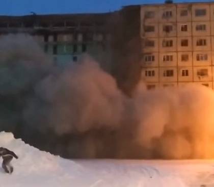 Очевидцы сняли обрушение многоэтажного расселенного дома в Норильске на Надеждинской улице, ролик появился в региональном паблике «ВКонтакте».