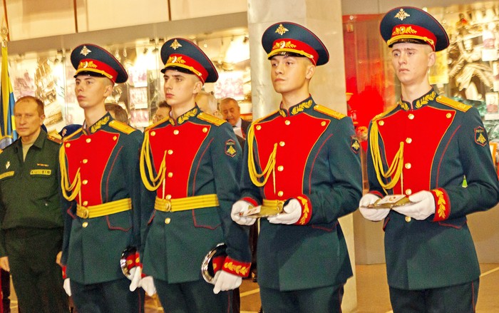 К тому моменту вокруг главной реликвии музея — Знамени Победы, водруженного в 1945 году над Рейхстагом, — уже собрались военнослужащие разных возрастов. По кругу выстроились ветераны Великой Отечественной войны и Вооруженных сил СССР и России, студенты Военного университета Минобороны, курсанты Суворовского училища, а также участники военно-патриотического движения «Юнармия».