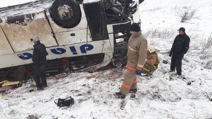 Два автобуса, следовавшие в попутном направлении, разъехались по обочинам для избежания столкновения. Один из них перевернулся, перелетев отбойник, и упал в кювет. В нем находились 19 человек.
