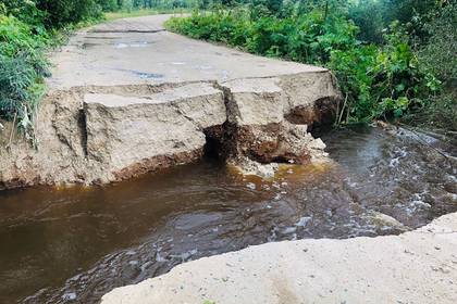 Сильные дожди привели к тому, что из берегов вышла река — она и разрушила дорогу.