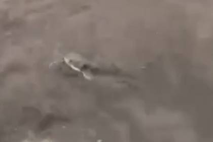 Рыба сопротивляется, рядом стоят прохожие и фотографируют необычный момент.