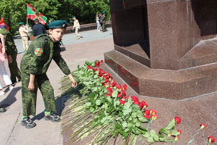 Юнармейцы также возложили цветы к памятнику пограничникам. Среди юнармейцев, получивших зеленый берет, был и внучатый правнук героя-пограничника Филатова — Виктор Фролов.