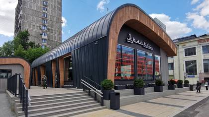 Здание павильона напоминает форму застывшей возле берега волны. Экологичное оформление объекта имеет смысловое значение. Так, здание символизирует поднятый пласт асфальта, бетона и металла застройки Москвы, который оголяет исторический слой столицы с ее деревянными домиками и ярмарочной торговлей. Сочетание таких материалов, как древесина, металл и камень, означает эффективное использование пространства и ресурсов.