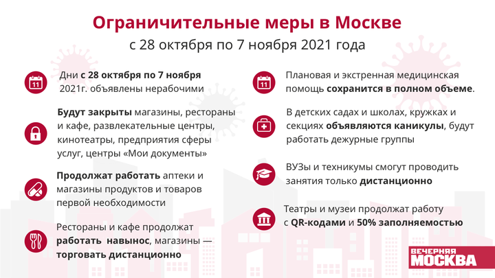 До этого мэр Москвы Сергей Собянин объявил, что для улучшения ситуации с коронавирусом в столице выходные начнутся с 28 октября и продлятся до 7 ноября.